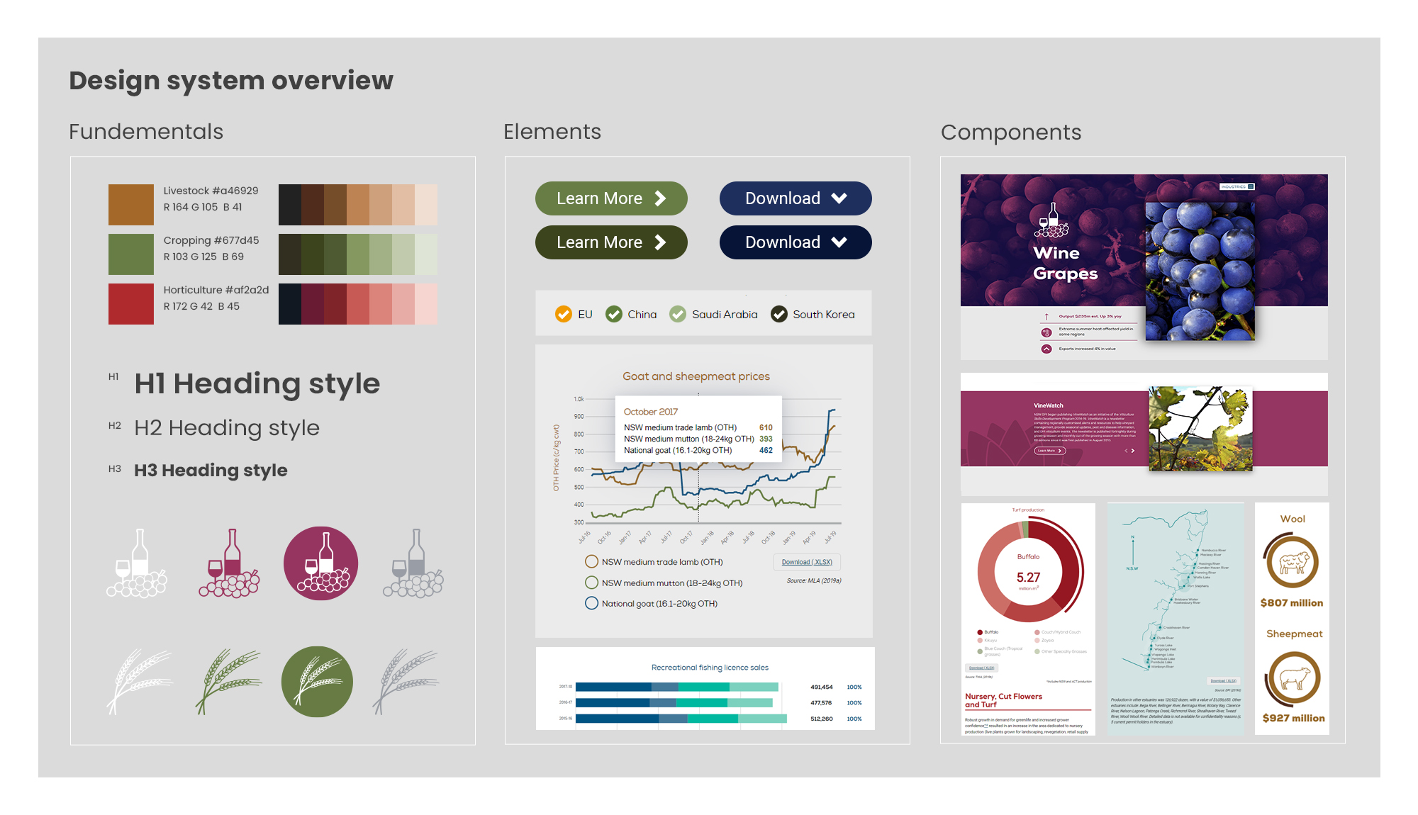 The NSW Government Department of Primary Industries (DPI) is responsible for promoting and supporting the sustainable development of primary industries in NSW, including agriculture, fisheries, and forestry. While principal at Beyond the Hedge, we won a tender to work with the department to showcase the economic output of these industries in an engaging data visualisation portal that would highlight the key statistics and trends of primary industries sectors each financial year. Our goal was to create an informative platform that would visualise the underlying strength and long-term viability of the primary industry sectors, while also providing users with easy access to important data and insights.